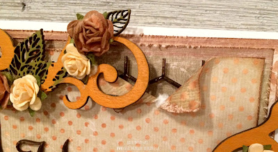 The last two pieces of chipboard you'll cover is the Skeleton Leaf Corners. Paint the scroll part on each corners with Spiced Marmalade Distress Paint. For the leaves on the corners, paint them with Peeled Paint Distress. You'll need to apply two coats to the scroll and to the leaves.